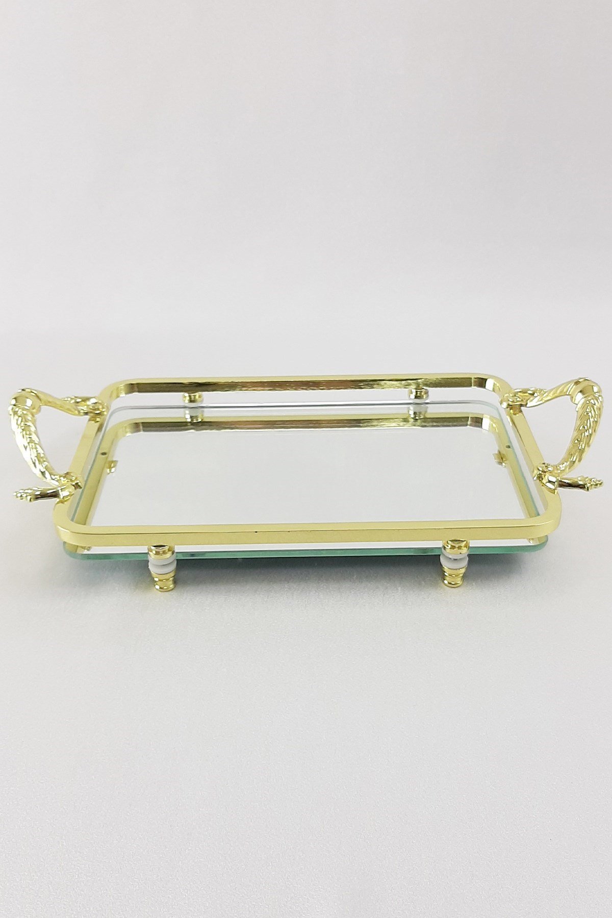 Altın Kulplu Dikdörtgen Söz Nişan Tepsisi Birinci Sınıf İşçilik İle İmal Edilmiştir. En:28cm Boy:18cm Yükseklik:2cm 3mm Cam Ayna ve Prinç Kullanılarak Yapılmıştır Sıvı Teması İçin Uygun Değildir.