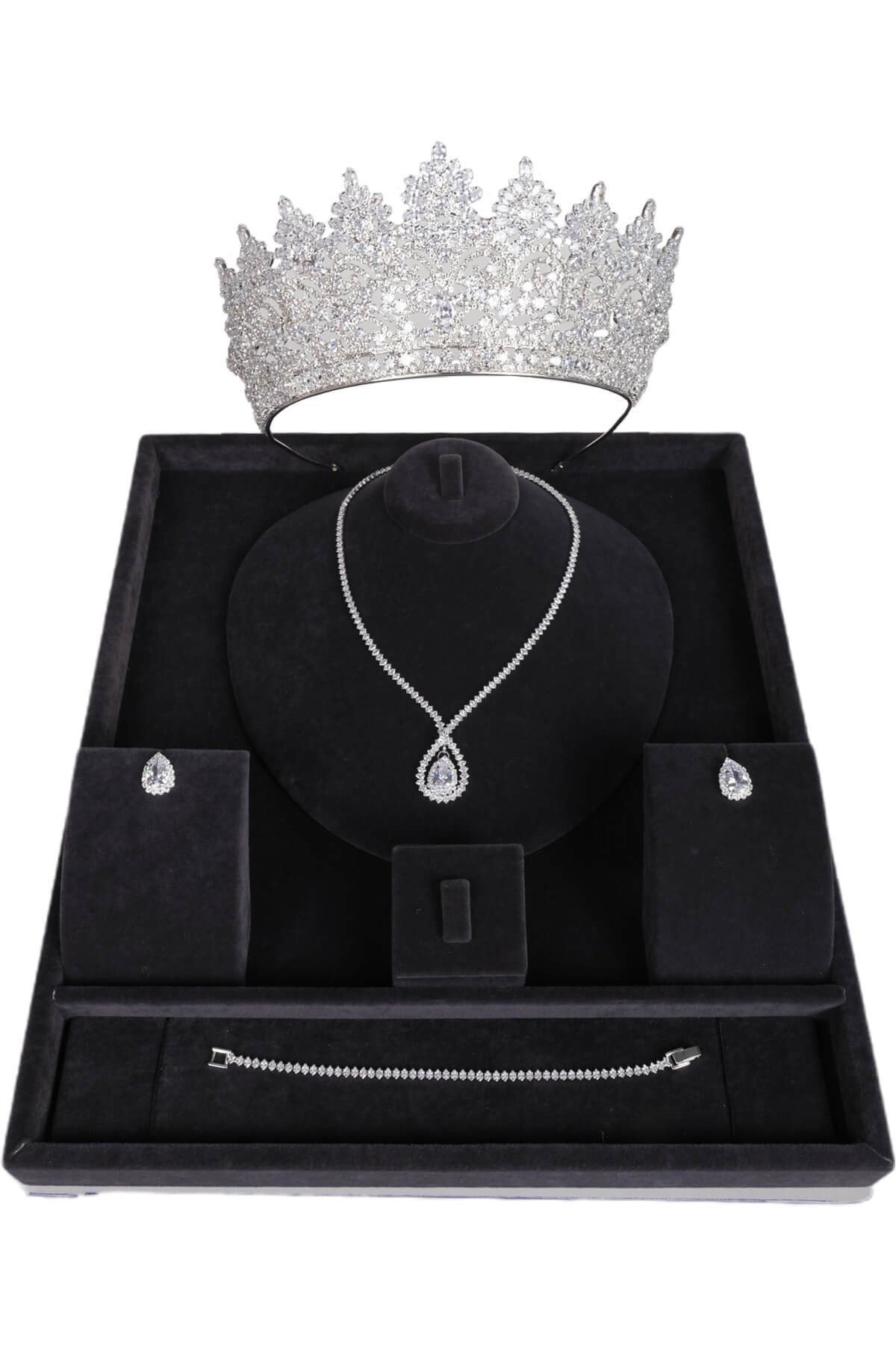 Angelina Zirkon Taşlı Gelin Tacı ve Kolye Küpe Bileklik Seti