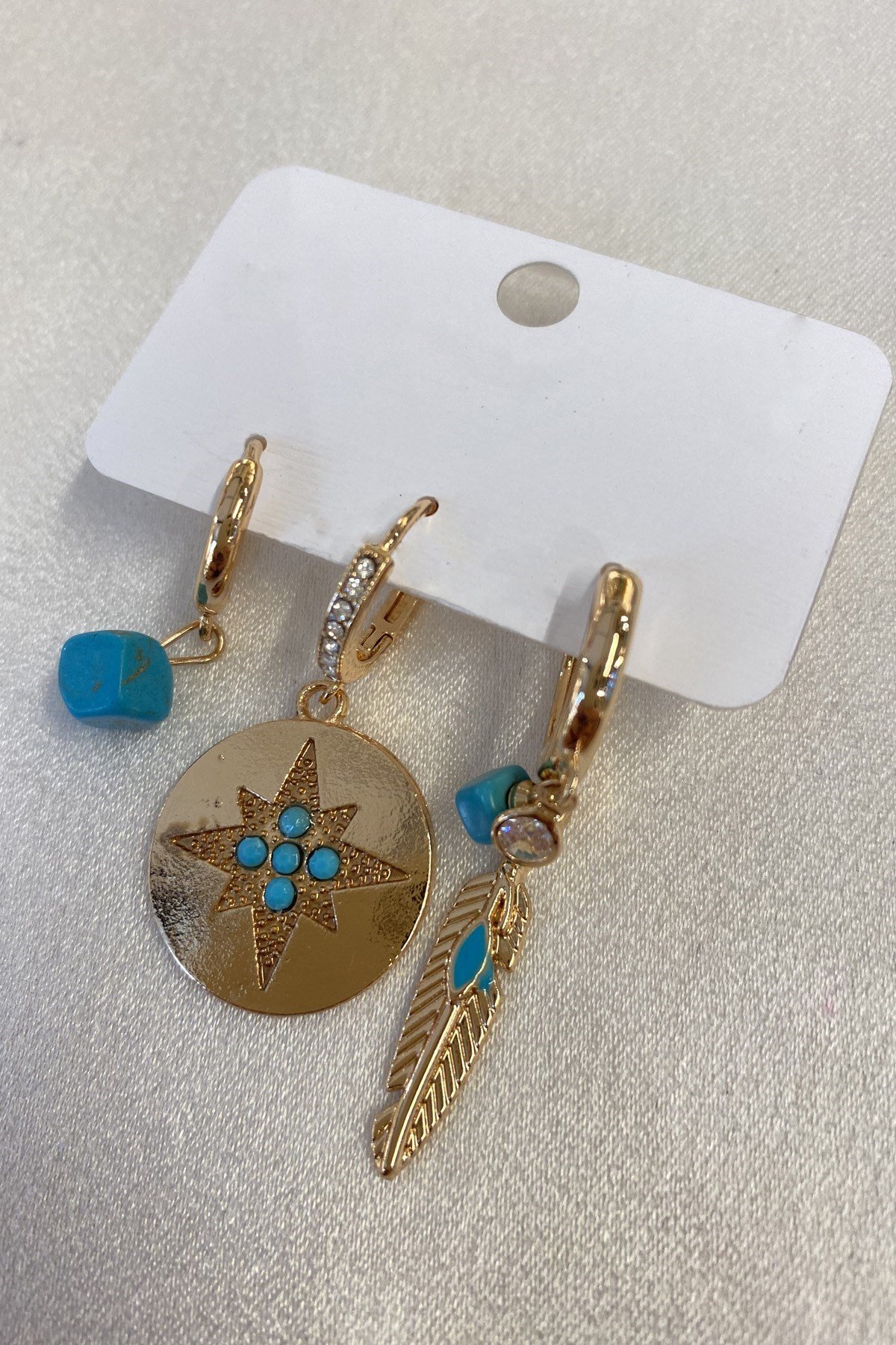 Gold Mavi Kuzey Yıldızlı Tüy Çoklu Küpe