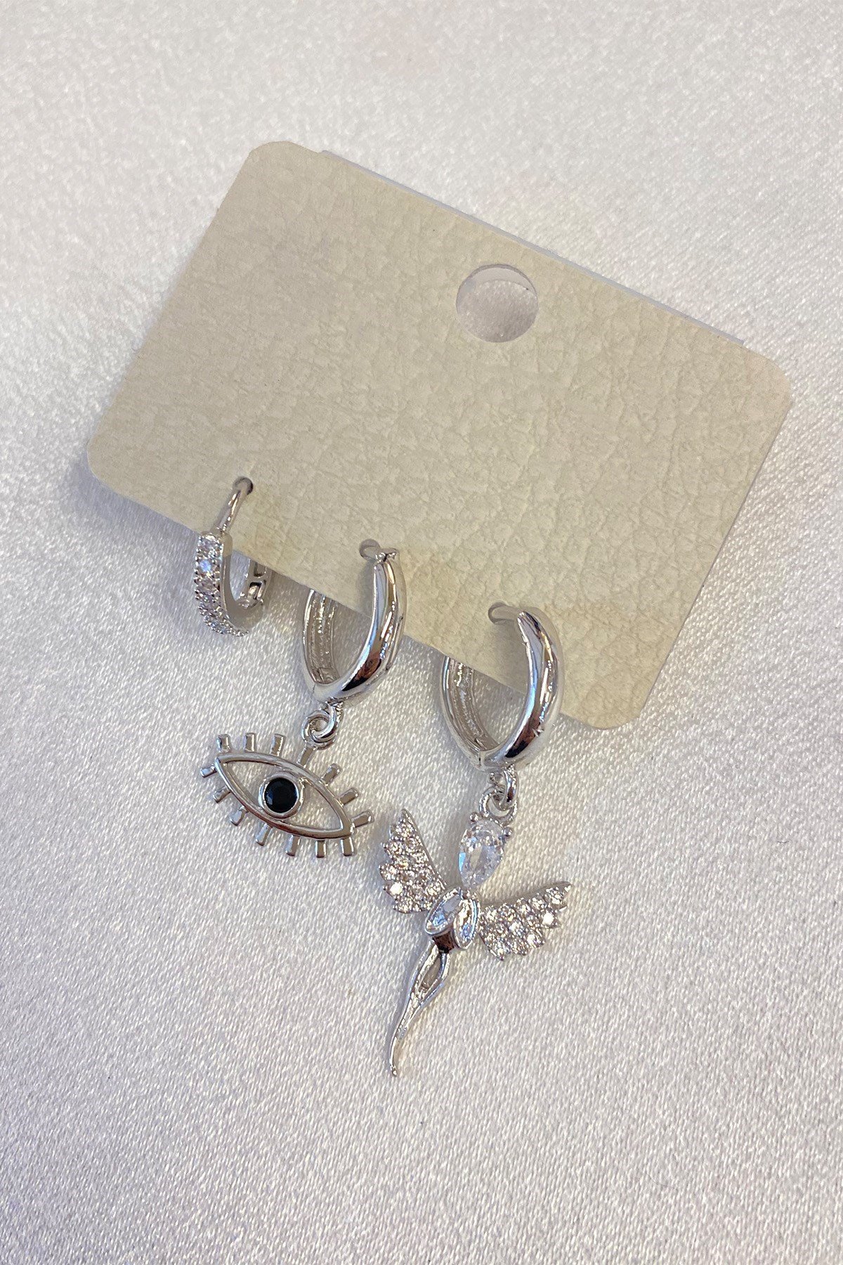 Gümüş Melek Kanatlı Taşlı Göz Çoklu Küpe
