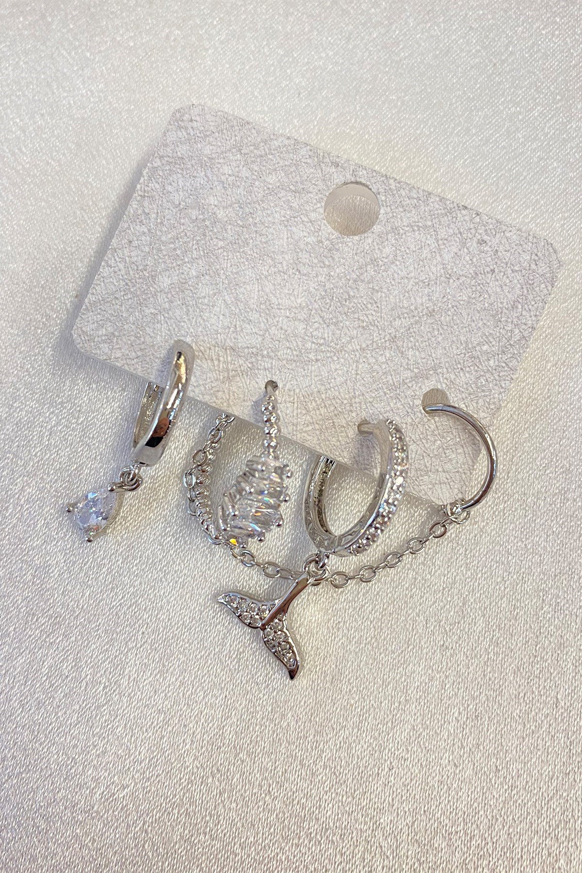 Gümüş Renk Taşlı Balık Kuyruklu Zincir Çoklu Küpe (TCK320)