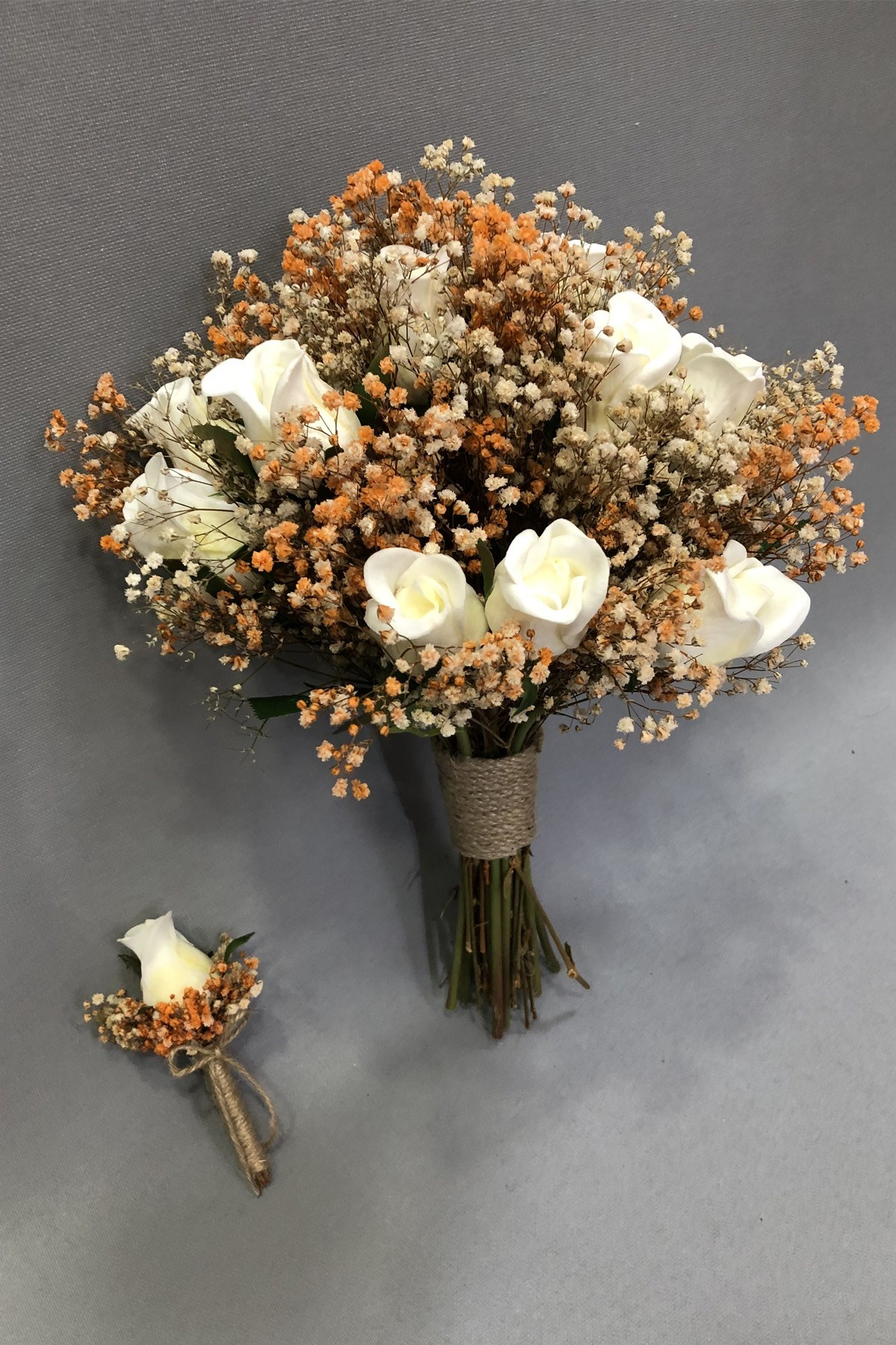 Islak Beyaz Gül Turuncu ve Krem Cipsolu Gelin Buketi Doğal Görünümlü Yapay Gelin Buketlerimizin Arasına Şoklanıp Kurutulmuş Kuru Çiçeklerle Yaptığımız Kombin Gelin Buketlerimiz Dogal Görünümü İle Öne Çıkmaktadır.Düğün Sezonunda ve Dış Çekimlerde En Çok Tercih Edilen Buketlerimizdir. Dilerseniz Daha Sonrada Evinizde Dekor Olarak Kullanabileceğiniz Buketlerimizi Uzun Süre Saklayabilirsiniz. Not: Dilerseniz Renk ve Model Değişikliğini Sizin Tercihinize Göre Tanzim Edebiliriz. Ölçüleri: 30 Cm X 30 Cm