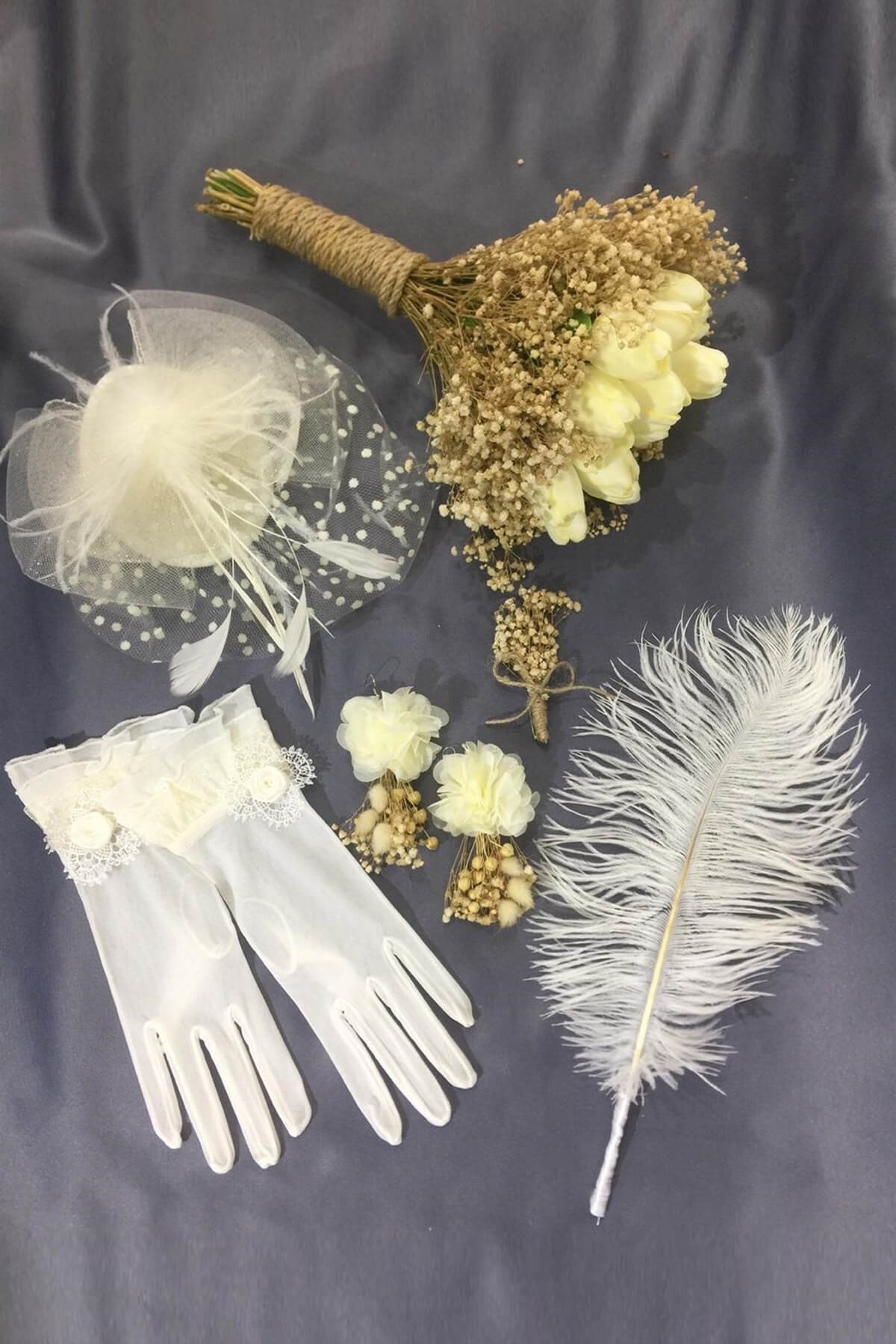Lale Gelin Çiçeği - Eldiven - Nikah Şapkası  - Kalem - Küpe - Yaka Çiçegi Seti