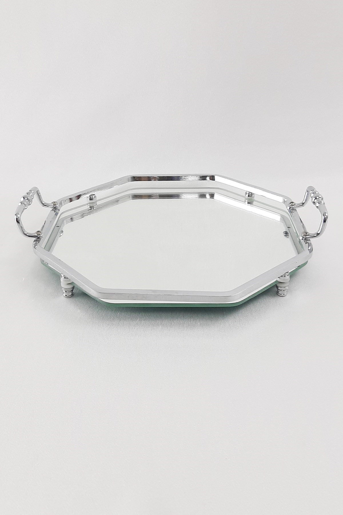Metal Altıgen Gümüş Söz Nişan Tepsisi Birinci Sınıf İşçilik İle İmal Edilmiştir. En:28cm Boy:18cm Yükseklik:2cm 3mm Cam Ayna ve Prinç Kullanılarak Yapılmıştır Sıvı Teması İçin Uygun Değildir.