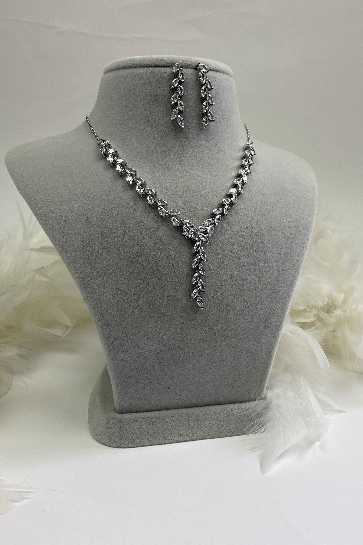 Metal Ve Mekik Zirkon Taş Detaylı Kolye Küpe Seti (trnd74)