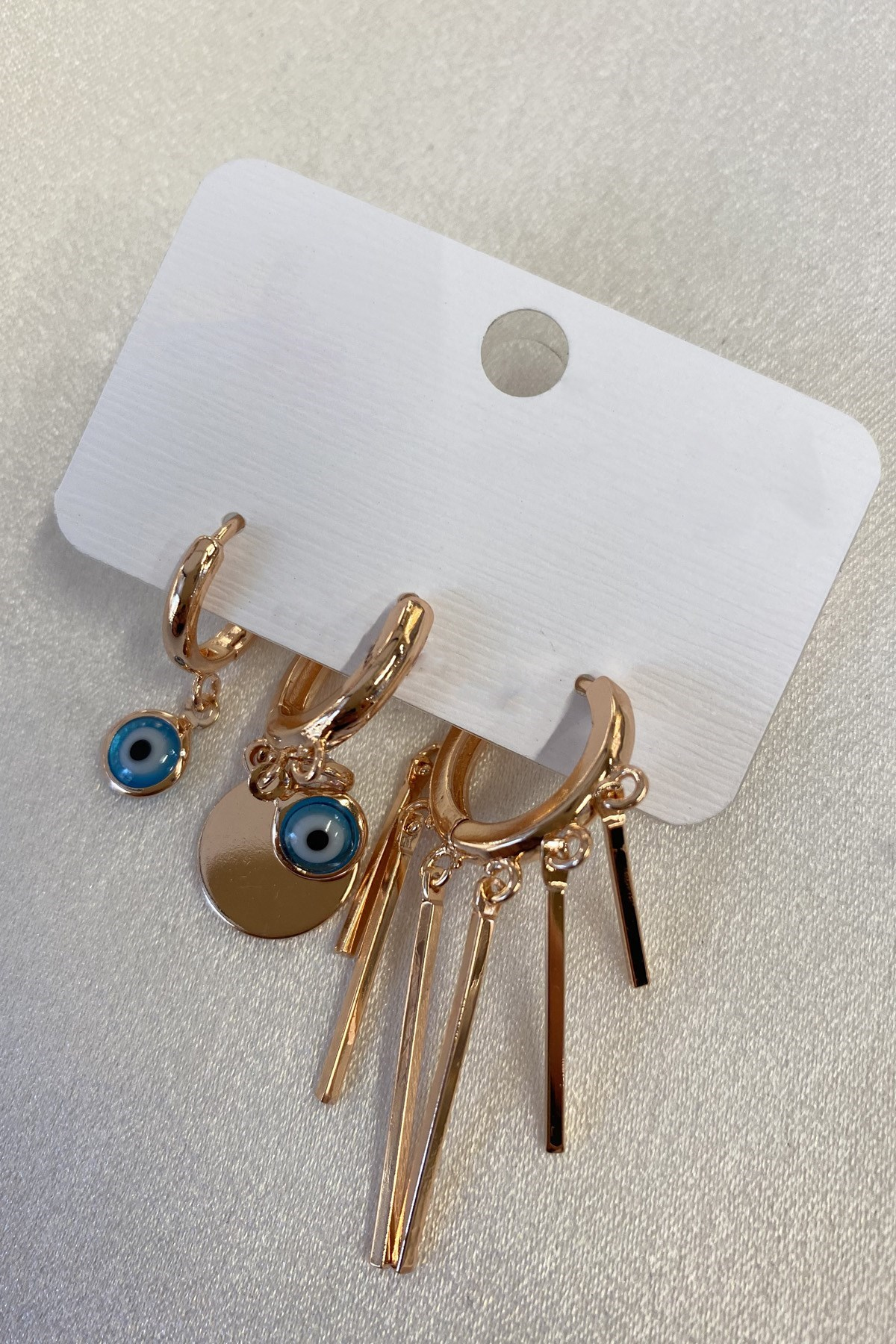 Rose Nazar Boncuklu Çubuk Detaylı Çoklu Küpe