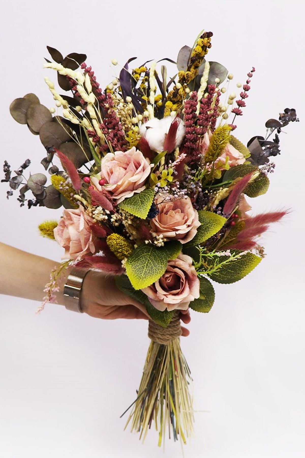 Doğal görünümlü yapay çiçeklerin kombini için Şoklanmış ve kurutulmuş çiçeklerle hazırladığımız  gelin buketlerimiz dogal görünümü ile öne çıkmaktadır